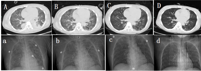2021-04-22患者在全麻下行右侧甲状旁腺腺瘤腔镜下切除术,术后病理报告:(右侧)符合甲状旁腺腺瘤。术后血清总钙2.45 mmol/L,甲状旁腺激素27.7 pg/mL, 停鲑降钙素肌肉注射治疗。CRRT设定血流量与枸橼酸钠泵速比为1∶1.3,监测血气分析调整静脉端补钙剂量,维持离子钙1.0~1.2 mmol/L范围,患者术后第2天经呼吸锻炼后脱机成功,气管切开处高流量吸氧。2021-04-25停止CRRT治疗。肺部CT:两肺炎症病变,较前吸收(图 2B, b)。2021-04-28停用抗生素治疗,改为鼻导管吸氧,开始床边坐起进行关节功能锻炼。2021-05-02肺部CT:两肺渗出性病变,较前明显吸收(图 2C, c),2021-05-09患者转康复病房进行肺功能训练、平衡功能训练、关节功能锻炼、中药辅助治疗。2021-05-17复查肺部CT:两肺渗出性病变,较上次明显吸收(图 2D, d)。2021-05-26血气分析:PH 7.37, 乳酸0.60 mmol/L,二氧化碳分压31.70 mmHg, 氧分压117.00 mmHg(1 mmHg=0.133 kPa), 氧饱和度100%(吸入氧流量21%),标准碳酸氢盐19.2 mmol/L。肾功能:肌酐104 μmol/L,肾小球滤过率61 mL/min,血清钙1.93 mmol/L。双上肢肌力5-级,双下肢肌力4+级,坐位平衡3级,立位平衡2级,2021-05-28患者要求出院回当地继续康复治疗。