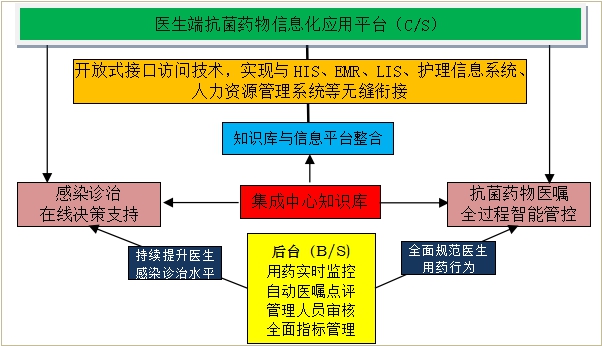 抗菌药物合理使用和临床应用管理是所有医疗机构共同面临的难题。国内迄今主要依赖“药师抽样检查或处方点评、偶邀请医生讨论、反馈临床、行政处理”的传统管理模式,局限性很明显,管理人员资源和能力难以克服、人工管理耗时费力、抽样调查的随机性和片面性大、分析结果以偏概全、事后回顾性管理具有滞后性,因此管控效果很差。近年国内外虽然有基于信息技术实现诊间提醒、用药数据抓取分析、门急诊处方筛查、手术预防用药疗程控制等,但都是基于药品说明书、某些指南或管理制度的非个性化警示或野蛮处置,专业性很差,或基于所在医院信息系统的以解决单点问题为目标的应用,由于缺乏专业知识库和流程规则的支撑,专业性和智能化差,不能实现过程管控,效果很有限,应用价值低。