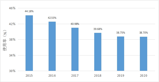 本院抗菌药物使用率总体呈下降趋势,由2015年的44.18%逐年下降至2019年的38.75%和2020年的38.70%,趋势χ2检验χ2=1 245.323,P<0.01。见图 2