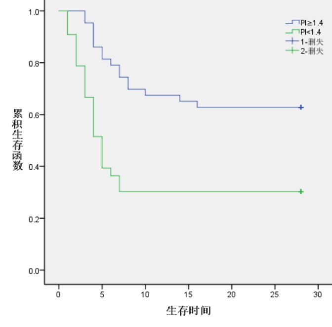 高PI(PI≥1.4)组43例,生存27例,中位生存时间20.09 d(95%CI: 16.95~23.24)。低PI(PI < 1.4)组33例,生存10例, 中位生存时间11.00 d(95%CI: 7.14~14.86)。Kaplan-Meier生存曲线分析显示,高PI组中位生存时间显著高于低PI组(χ2=12.424,P < 0.001)。见图 1。