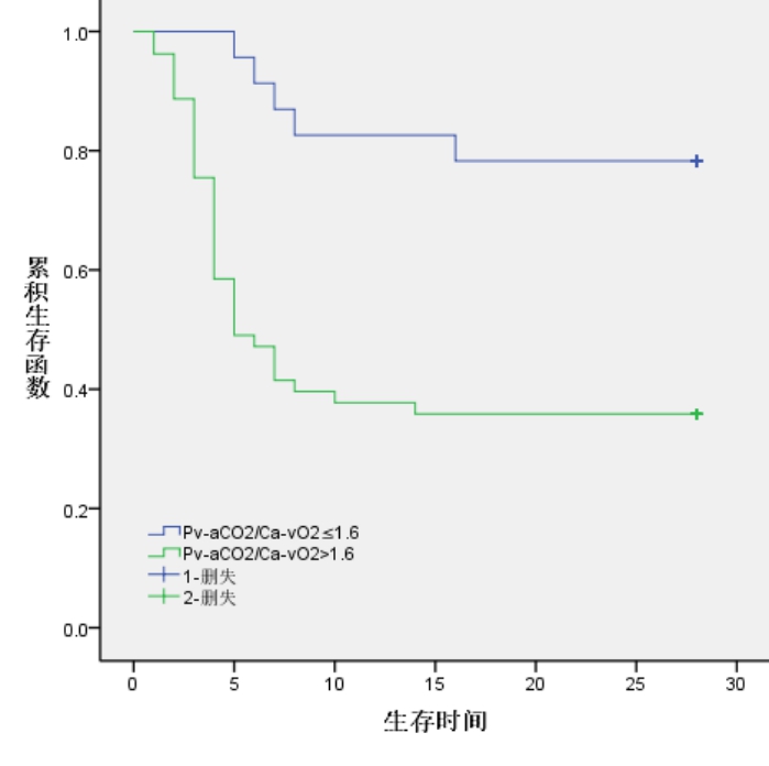 高Pv-aCO2/Ca-vO2(Pv-aCO2/Ca-vO2>1.6)组53例,生存19例,中位生存时间12.85 d(95%CI: 9.75~15.95)。低Pv-aCO2/Ca-vO2(Pv-aCO2/Ca-vO2≤1.6)组23例,生存18例, 中位生存时间23.74 d(95%CI: 20.35~27.13)。Kaplan-Meier生存曲线分析显示,低Pv-aCO2/Ca-vO2组中位生存时间显著高于Pv-aCO2/Ca-vO2组(χ2=12.200,P < 0.001)。见图 2。