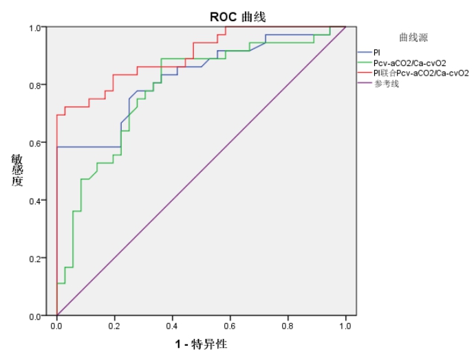 | 图 3 始复苏3 h的PI、Pv-aCO2/Ca-vO2、PI联合Pv-aCO2/Ca-vO2预测患者28 d死亡的ROC曲线 Fig 3 ROC curves of PI, Pv-aCO2/Ca-vO2, PI combined with Pv-aCO2/Ca-vO2 at 3h of initial resuscitation for predicting 28 d mortality |
