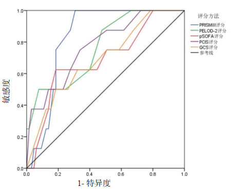 PCIS、PRISM Ⅲ、PELOD-2、p-SOFA和GCS评分预测SAE预后的AUC分别为0.773(P=0.012, AUC > 0.7),0.832(P=0.02, AUC > 0.7),0.767(P=0.014, AUC > 0.7),0.688(P=0.084, AUC < 0.7),0.692(P=0.077,AUC < 0.7);PCIS、PRISM Ⅲ、PELOD-2评分间AUC两两比较差异无统计学意义。见表 3,图 1。