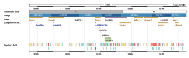 2 结果 2.1 LncRNA- B230352I09的基本特征LncRNA B230352I09在小鼠基因组定位于7号染色体: 123031415-123066439 forward strand,全长663 bp。与该lncRNA相邻基因有Rbbp6(图 1)。catRAPID(http://service.tartaglialab.com/page/catrapid_group),预测lncRNA结合蛋白发现Rbbp6可能是其结合的蛋白(http://service.tartaglialab.com/email_redir/374511/b75e1e7644)。