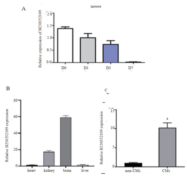 | A: LncRNA B230352I09在出生后7 d内的小鼠心脏组织中的表达规律;B : LncRNA B230352I09在出生后1 d的小鼠器官分布;C : LncRNA B230352I09在出生后1 d的小鼠心脏组织分布, aP<0.05 图 2 LncRNA B230352I09在小鼠心脏中的时空表达规律 Fig 2 Temporal and spatial expression of lncRNA B230352I09 in mouse heart |