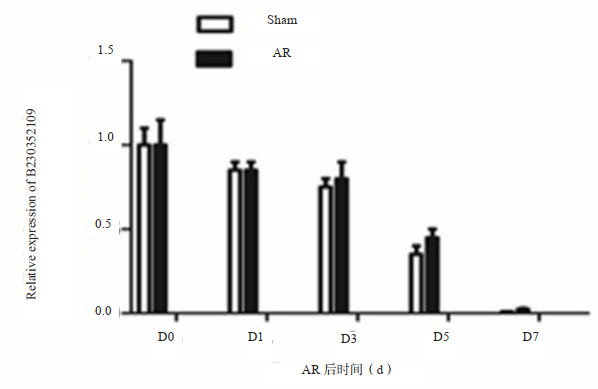 通过real-time PCR检测lncRNA B230352I09在心肌损伤前(d0)、后不同时间点(d1、d3、d5、d7)的表达水平。结果发现,lncRNA B230352I09在心肌损伤后表达水平呈现逐渐下降趋势,相对正常发育小鼠lncRNA B230352I09表达量有升高趋势,但差异无统计学意义[D0(1.0± 0.1) vs. (1.0± 0.08),P=0.95;D1(0.83± 0.01) vs. (0.84± 0.01),P=0.49;D3(0.75± 0.06) vs (0.85± 0.1),P=0.25;D5(0.37± 0.04) vs. (0.43± 0.05),P=0.16;D7(0.01± 0.001) vs. (0.02± 0.004),P=0.13](图 3)。