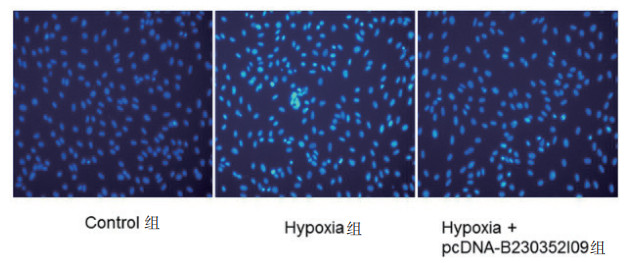 | 图 4 过表达lncRNA B230352I09对缺氧心肌细胞凋亡的影响(×200) Fig 4 Effect of overexpression of lncRNA B230352I09 on apoptosis of hypoxic cardiomyocytes |