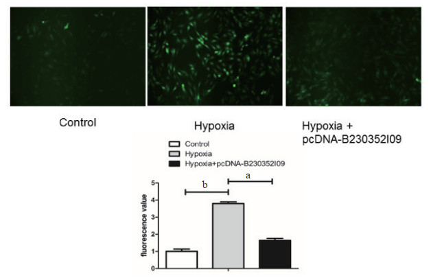 | aP < 0.05, bP < 0.01 图 5 过表达lncRNA B230352I09对缺氧心肌细胞ROS的影响(×100) Fig 5 Effect of overexpression of lncRNA B230352I09 on ROS in hypoxic cardiomyocytes(×100) |