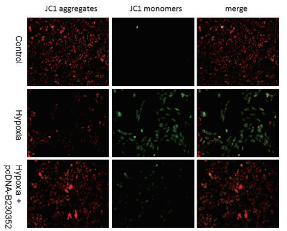 培养原代心肌细胞,构建缺氧模型,Hoechst染色试剂盒检测示心肌细胞缺氧损伤后细胞表现出明显的凋亡状态:细胞核致密浓染,呈碎块状,lncRNA B230352I09过表达处理后可明显抑制缺氧损伤后心肌细胞凋亡(图 4);DCFDA探针法检测缺氧损伤后心肌细胞ROS含量显著升高([(1.0±0.11) vs. (3.8±0.71),P=0.002]),lncRNA B230352I09过表达干预后明显减少缺氧心肌细胞ROS生成([(3.8±0.71) vs. (1.65±0.56),P=0.015])(图 5);JC-1荧光探针检测缺氧心肌细胞线粒体膜电位变化,结果显示lncRNA B230352I09过表达组心肌细胞线粒体膜电位较缺氧组明显增高(图 6)。