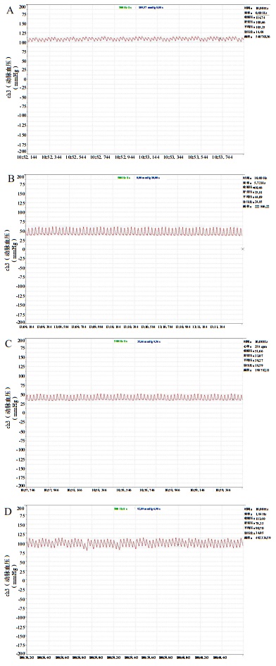 | A:休克前;B:诱导休克后1 h;C:诱导休克后2 h;D:复苏后 图 1 休克大鼠不同时相MAP的变化 Fig 1 Changes of MAP at different time points in rats with shock |