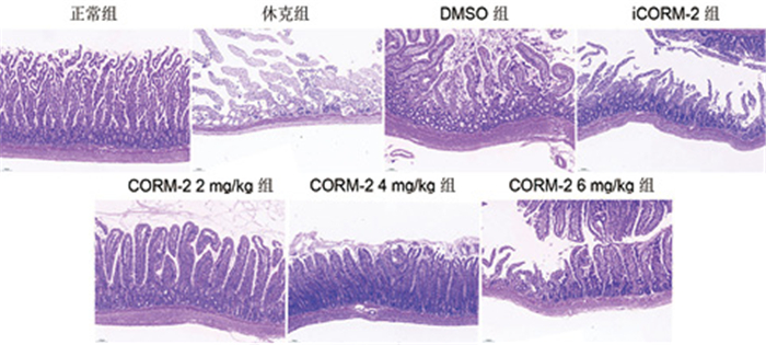 假手术组大鼠回肠黏膜上皮完整,腺体结构清晰,绒毛排列整齐;休克组大鼠回肠绒毛结构消失,绒毛表面游离,肠上皮细胞出现大量坏死,结构不连续,破坏明显,有大量炎症细胞聚集;CORM-2 4 mg/kg组和6 mg/kg组大鼠回肠上皮细胞少量坏死,绒毛部分节段结构不连续,未见明显水肿,较其他休克组明显改善;见图 2。由表 2可见,与假手术组比,休克各组肠黏膜组织病理Chiu评分均升高(均P < 0.05);与休克组、iCORM-2组和DMSO组相比较,CORM-2不同剂量组Chiu评分均降低(均P < 0.05);但CORM-2各剂量组之间比较,肠黏膜组织病理Chiu评分无差异(均P>0.05)。