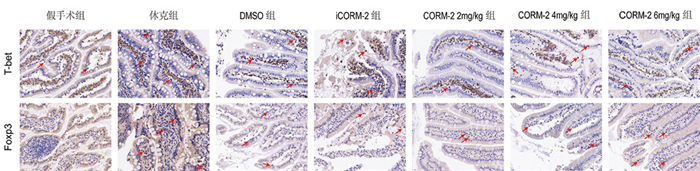 与假手术组比较,休克组、DMSO组和CORM-2 6 mg/kg组肠黏膜淋巴细胞Foxp3抗原表达升高(均P < 0.05);CORM-2 2 mg/kg组、CORM-2 4 mg/kg组及iCORM-2组Foxp3抗原表达较休克组和DMSO组均减低(均P < 0.05),但CORM-2 6 mg/kg组与休克组或DMSO组比较差异无统计学意义(均P>0.05);休克组和DMSO组之间Foxp3抗原表达差异无统计学意义(P>0.05)。见图 4。