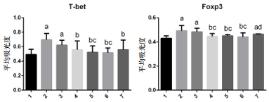 | 1~7依次为假手术组、休克组、DMSO组、iCORM-2组、CORM-2 2 mg/kg组、CORM-2 4 mg/kg组、CORM-2 6 mg/kg组;与假手术组相比,aP < 0.05;与休克组相比,bP < 0.05;与DMSO组相比,cP < 0.05;与iCORM-2组相比,dP < 0.05 图 4 各组大鼠肠黏膜T-bet、Foxp3抗原阳性表达的平均吸光度值比较 Fig 4 Comparison of average optical density of T-bet and Foxp3 antigen-positive expression in intestinal mucosa of rats in each group |