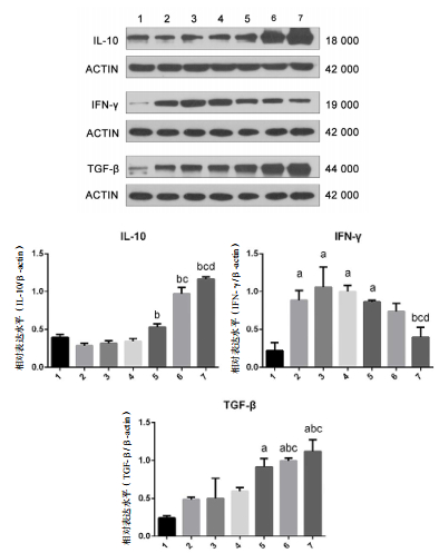 | 1~7依次为假手术组、休克组、DMSO组、iCORM-2组、CORM-2 2 mg/kg组、CORM-2 4 mg/kg组、CORM-2 6 mg/kg组;与假手术组相比,aP < 0.05;与休克组相比,bP < 0.05;与DMSO组相比,cP < 0.05;与iCORM-2组相比,dP < 0.05 图 5 各组大鼠回肠组织IL-10、IFN-γ、TGF-β蛋白相对表达水平比较 Fig 5 Comparison of expression levels of IL-10, IFN-γ, and TGF-β protein in ileum of rats in each group |