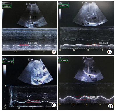 | A:感染性休克患者;B:脓毒症患者;C:术后患者;D:健康志愿者 图 1 膈肌移动度 Fig 1 Diaphragmatic excursion |