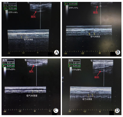 | A:感染性休克患者;B:脓毒症患者;C:术后患者;D:健康志愿者 图 2 膈肌厚度 Fig 2 Diaphragmatic thickness |