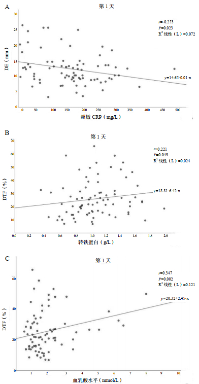 | A:DE与超敏CRP;B:DTF与转铁蛋白;C:DTF与血乳酸水平 图 3 DE、DTF与其他指标的相关性散点图(第1天) Fig 3 Correlation scatter plot of DE, DTF and other indicators (Day1) |