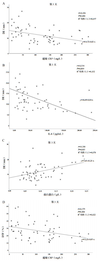 | A:DE与超敏CRP;B:DE与IL-6;C:DE与前白蛋白;D:DTF与超敏CRP 图 4 DE、DTF与其他指标的相关性散点图(第3天) Fig 4 Correlation scatter plot of DE, DTF and other indicators (Day3) |