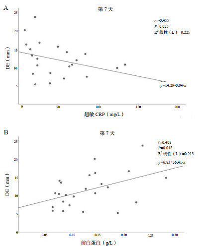 | A:DE与超敏CRP;B:DE与前白蛋白 图 5 DE与其他指标的相关性散点图(第7天) Fig 5 Correlation scatter plot of DE and other indicators (Day7) |