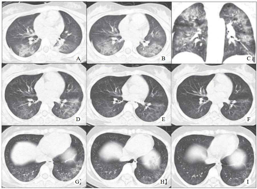 A~F分别为第一至五次CT同一层面的影像表现,第一次CT(A)主要表现为斑片状渗出灶和磨玻璃影,第二次CT(B和C)示渗出灶更明显,后三次CT可见渗出灶及磨玻璃影吸收、消散;G-I分别为第三至五次CT,第三次CT(G)示双肺下叶背侧胸膜下可见磨玻璃影之上的网格影及胸膜下线影,提示出现间质纤维化改变;第四次CT(H)示双肺背侧明显的间质纤维化改变;第五次CT(I)选择与前一次CT同一层冠状面,示间质纤维化较前一次CT明显减轻 图 1 一位12岁男患儿吸入性肺损伤后CT图像的动态演变过程