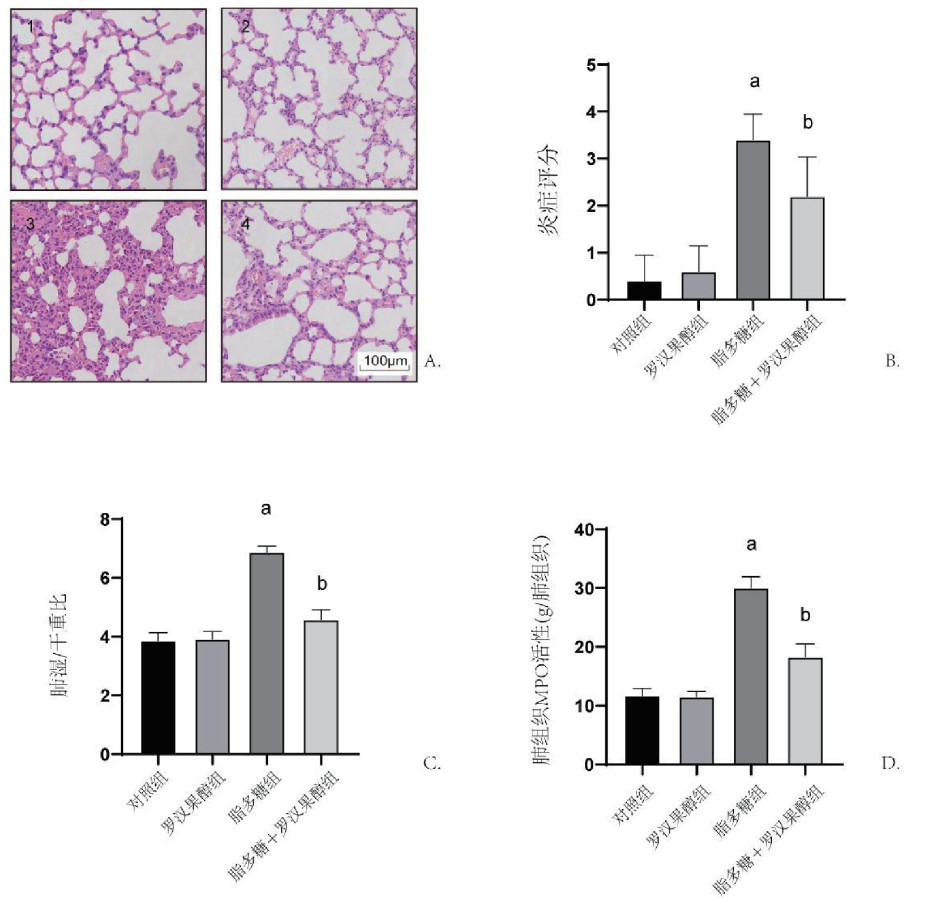 | 脂多糖+罗汉果醇组 | 42.63±4.19b | 79.39±4.85b |