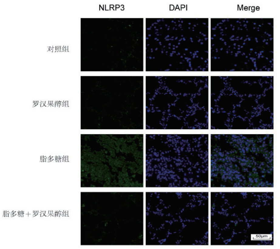 取小鼠肺组织切片免疫荧光染色,结果显示与对照组相比,脂多糖刺激后,肺泡腔结构破坏的同时重要的炎性小体成分NLRP3的表达显著提高[(36.45±3.06) vs. (1.17±0.88),P < 0.05];而脂多糖+MO组小鼠肺组织NLRP3表达受到明显抑制[(13.68±1.33) vs. (36.45±3.06),P < 0.05],差异有统计学意义(图 2,表 3)。
