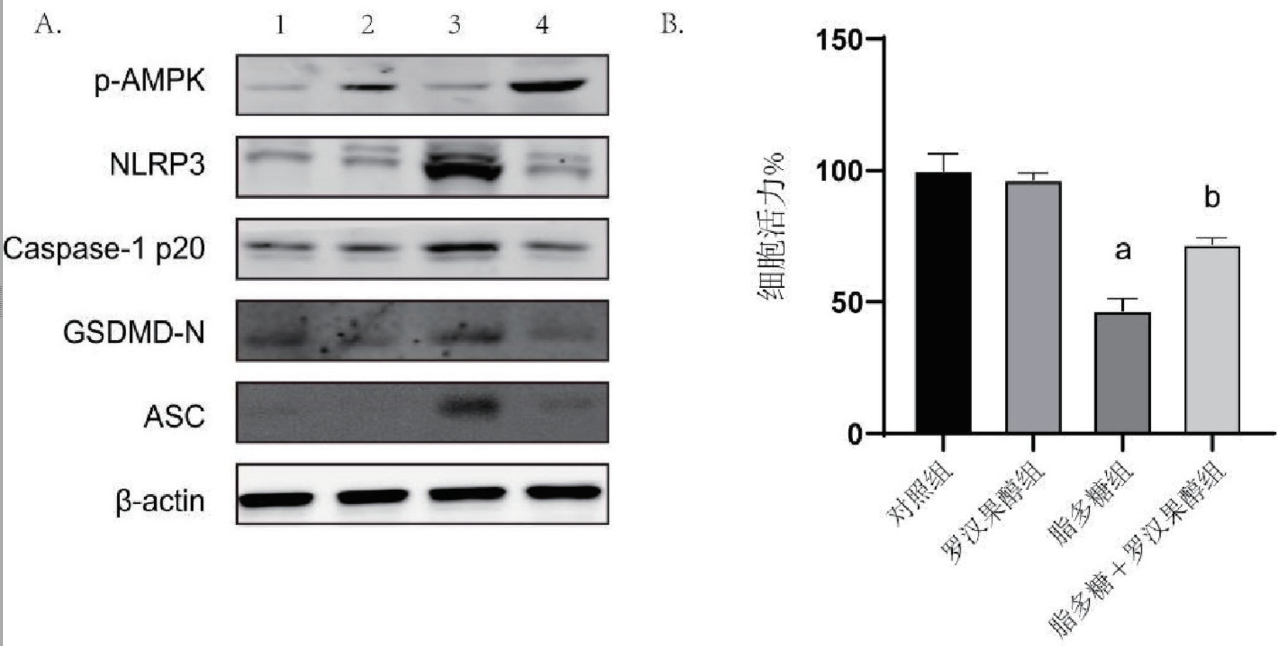 | A.各组细胞蛋白表达变化,1为对照组,2为罗汉果醇组,3为脂多糖组,4为脂多糖+罗汉果醇组;B.各组细胞活力变化,注:与对照组比较,aP < 0.05;与脂多糖组比较,bP < 0.05 图 4 在巨噬细胞中,MO可缓解脂多糖诱导的细胞焦亡 Fig 4 MO alleviated the pyrophosis induced by lipopolysaccharide in macrophages |