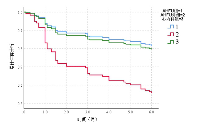 急诊AHFU组患者院内发生AKI(7.5%)低于AHFU外组(28.4%),差异具有统计学意义(P < 0.05);急诊AHFU组与心内科组发生AKI(14.0%)相比差异无统计学意义(P>0.05)。急诊AHFU组6个月内病死率(10%)与急诊AHFU外组(19.4%),差异无统计学意义(P>0.05)。急诊AHFU组与心内科组(5.5%)相比,差异无统计学意义(P>0.05)。急诊AHFU组患者6个月内再入院率(15%) 低于急诊AHFU外组(40.3%),差异有统计学意义(P < 0.05),相近于心内科(17.2%),差异无统计学差异(P>0.05)。急诊AHFU组患者6个月内再入院与病死率复合结果(17.5%)低于AHFU外组(43.3%),差异有统计学意义(P < 0.05);相近于心内科组(19.4%),差异无统计学意义(P>0.05)。见表 6、表 7。