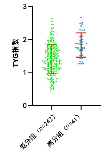 | 图 1 SYNTAX低分病变组与SYNTAX高分病变组TYG指数分布散点柱状图 |