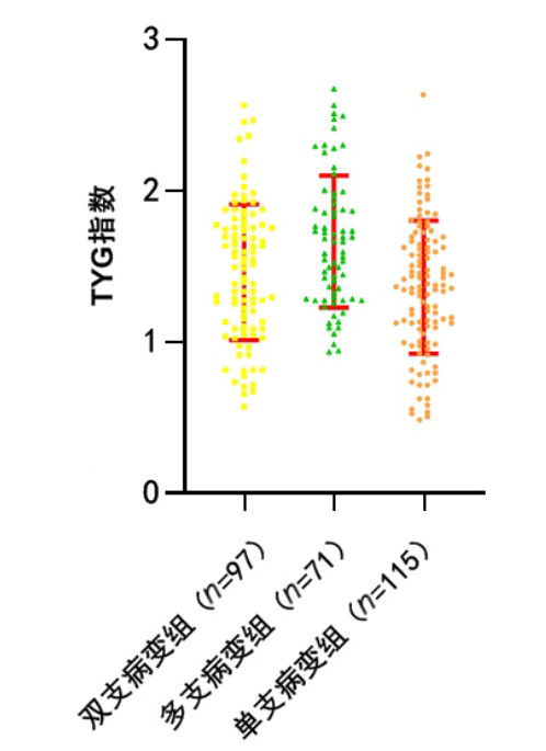 | 图 2 冠脉病变支数分组TYG指数分布散点柱状图 |