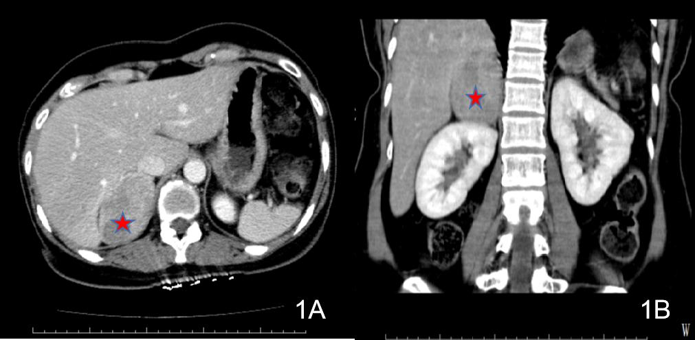 图 1 2017-11-20患者1腹部CT(右侧肾上腺区肿块)