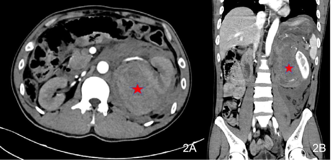 患者2,男性,34岁,因“突发左侧腰腹部疼痛10 h”于2021-06-17入本院泌尿外科。患者10 h前突发左侧腰腹部疼痛,呈胀痛,无向他处放射,疼痛较重,难以忍受,伴有头晕、心悸、乏力,无畏寒、发热,无尿急、尿频、尿痛,无肉眼血尿,立即送至当地医院就诊,查腹部CT提示“左侧肾上腺肿瘤伴出血”,在当地医院治疗过程中,患者血压进行性下降,需大剂量升压药物维持,急转本院入泌尿外科。