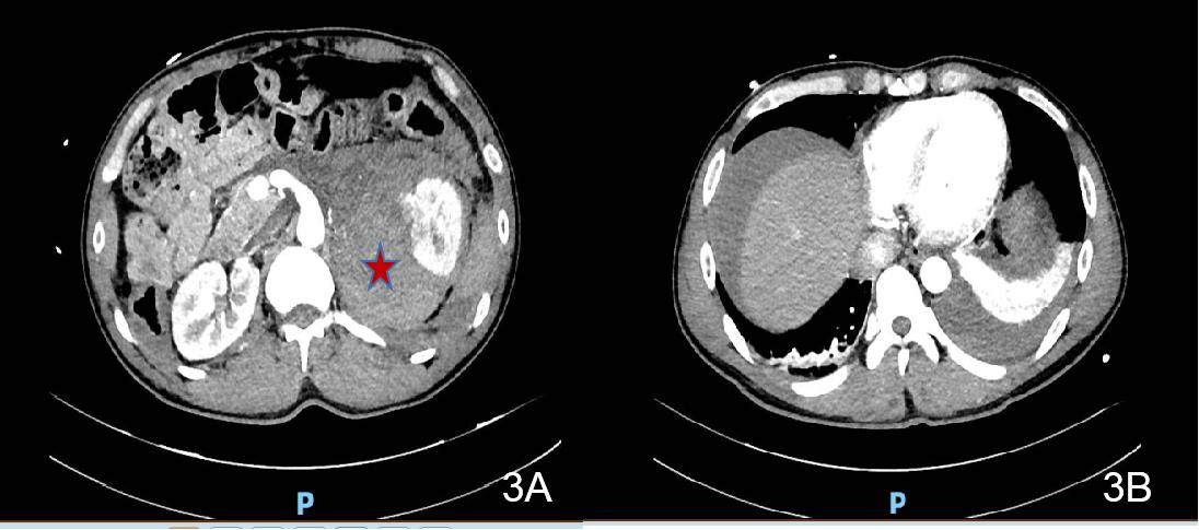 诊治经过如下。入院后查:HGB 81 g/L;生化十项(住院):CR 123.1 μmol/L,GLUC 22.22 mmol/L;心肌损伤标志物:TnI >50.0 ng/mL,MYO 377.45 ng/mL,CKMB Ⅱ 80.86 ng/mL;血气分析:pH 7.361,PCO2 33.5 mmHg,PO2 144.0 mmHg,BEb −5.0 mmol/L。予吸氧、积极补液扩容及输注悬浮红细胞(6U)、控制血糖等治疗。2021-06-18凌晨复查CT提示“左侧肾上腺区占位范围较前相仿,腹腔内积液较前增多”(见图 3)。2021-06-18早上复查BCA示Hb回升至115 g/L。