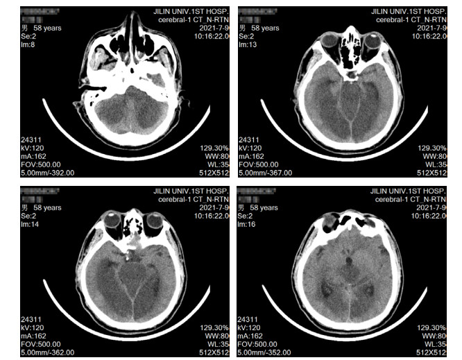 患者男性,58岁,因“头晕、黑矇3 d,意识不清15 h”于2021-07-07 18:53急诊以“意识障碍待查”收入本院重症医学科。患者3 d前无明显诱因出现头晕、黑矇,共发作7~8次,每次持续5~10 min后自行缓解,上述症状与体位无关,不伴有头痛、耳鸣、视物双影及视物旋转,无发热,曾于当地医院就诊考虑“眩晕症”,给予静点川芎嗪及血栓通后上述症状有所缓解。于入本院前15 h如厕时被家属发现倒地,呼之不应,无抽搐发作,无尿便失禁,无舌咬伤及呕吐,急由120救护车送至当地医院,测体温42.0℃(距离发病1 h),行头部及肺部CT未见明显异常,肝肾功能及降钙素原结果均正常,为求明确诊疗转诊至本院,急诊以“意识障碍待查”收入重症医学科。病程中无咳嗽、咳痰,无尿急、尿频、尿痛,无恶心、呕吐,无腹痛、腹泻。既往史情况:发现高血压病史1年,血压最高160/80 mmHg(1 mmHg=0.133 kPa),未系统诊治及监测。脑梗死病史1年。吸烟史20年,约10支/d,未戒。饮酒史20年,约100 g/d,戒酒1年余。入科查体:体温39.1℃,脉搏114次/min,呼吸23次/min,血压129/80 mmHg,外周血氧饱和度98%(鼻导管吸氧,氧流量3 L/min)。意识不清,GCS评分5分,双侧瞳孔等大同圆,直径约4.5 mm,直接、间接对光反射迟钝,皮肤、巩膜无黄染,咽部无红肿,扁桃体无肿大,气管居中,听诊双肺呼吸音清,未闻及干湿啰音。心率114次/min,律整,各瓣膜听诊区未闻及杂音及额外心音。腹软,肝脾肋下未触及,肠鸣音3~4次/min。双下肢无水肿,项强征阴性,双侧babinski征阳性,kernig征阴性,余查体不配合。辅助检查(2021-07-07,当地医院),血常规:WBC 12.3 × 109/L, NE% 67.6%,PLT 245 × 109/L,PCT 0.18 ng/mL, 肌酸激酶420 U/L,感染标志物:乙肝(−),丙肝(−),肝功能:AST 50 U/L,ALT 40 U/L, 入科诊断:意识障碍待查、发热原因待查。入科后给予降温、促醒对症治疗,约6 h后体温降至38.5℃,但患者意识无恢复,无自主咳痰能力,双肺可闻及痰鸣音,于2021-07-08给予气管插管及呼吸机辅助通气,同日出现血压下降,给予补液、升压(去甲肾上腺素)对症治疗。入科后进一步完善相关检查包括,出血热抗体:阴性,呼吸道病原核酸检测:阴性,IL-4 4.05 pg/mL,IL-6 229 pg/mL,IL-10 22.90 pg/mL,肌酸激酶13 383 Μ/L,肌红蛋白4 077 ng/mL;血栓弹力图:R 10.8 min,MA-CK 21.4 mm,K 23.4 min,综合凝血指数-19.9;肝功能:AST 2 643.0 M/L,ALT 2 711.9 M/L,ALB 32.1 g/L,TB 142.5 μmmol/L,DB 85.1 μmmol/L,CB 57.4 μmmol/L;肾功能:Scr 94.3 μmol/L、BMN 7.1 mmol/L;血常规及凝血相关指标变化见表 1;头部CT提示双侧小脑半球、脑干、双侧枕叶、丘脑、放射冠、半卵圆中心低密度影(图 1);肺部CT提示支气管炎、双肺散在炎症、胸主动脉及冠脉动脉硬化(图 2)。综合病史、体征和辅助检查明确临床诊断为:椎基底动脉脑梗死、中枢性高热、多器官功能障碍综合征(循环、肝脏、血液)、横纹肌溶解综合征,给予脱水降颅压、营养神经、促醒、纠正凝血异常对症治疗,患者病情无好转,于2021-07-09家属放弃治疗,出院后死亡。