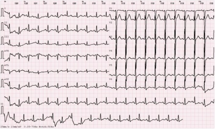 | 图 1 患者心电图检查结果(窦性心动过速,左心室肥大) |