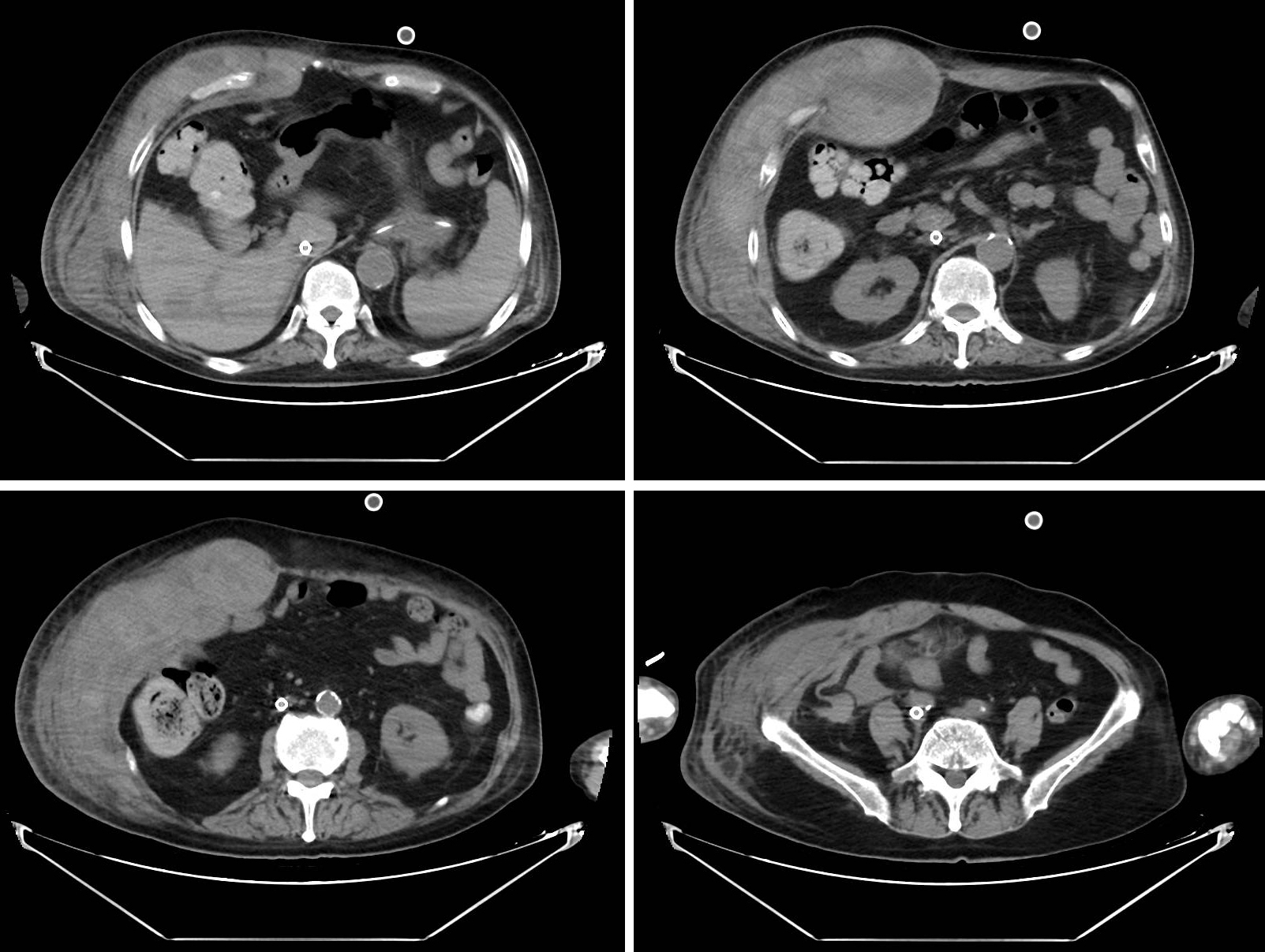 | 右侧腹壁软组织弥漫性增厚、渗出明显,见包裹性高密度影,高密度区CT值约45 HU,考虑腹直肌鞘血肿 图 2 患者入院后第9日腹部CT |