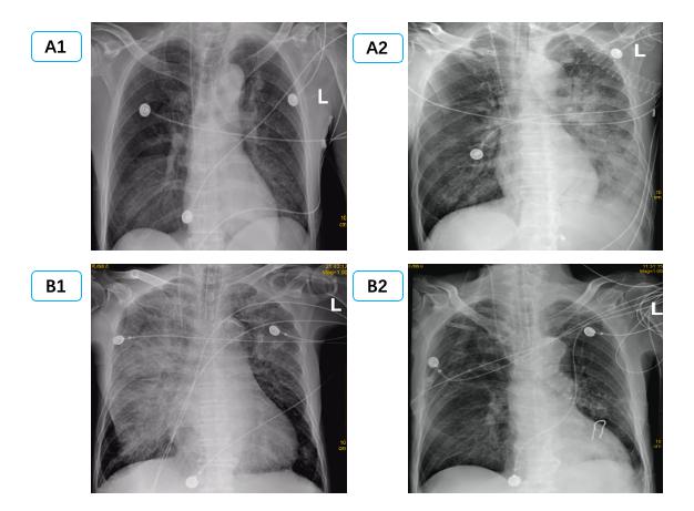 (A1、A2为同一患者,左侧PE,男,65岁,A1为发病前,A2为心脏骤停4 h后。B1、B2为同一患者,右侧PE,男,68岁,B1为心脏骤停后4 h后,B2为治疗3 d后。) 图 1 单侧肺水肿胸片表现 Fig 1 Manifestations of unilateral PE on X-ray