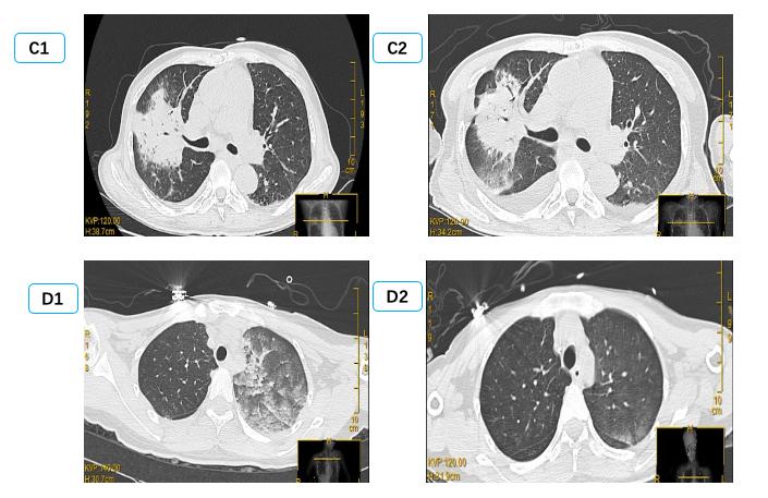 (C1、C2为同一患者,右侧PE,男,56岁,冠状动脉搭桥术后,C1为咳嗽咳痰1周入院时,C2为抗感染治疗14 d后。D1、D2为同一患者,左侧PE,女,32岁,眼眶下局麻后心脏骤停,D1为心脏骤停后3 h,D2为心脏骤停后24 h。) 图 2 单侧肺水肿CT表现 Fig 2 Manifestations of unilateral PE on CT