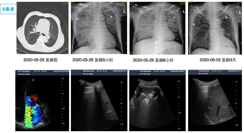 由于单侧PE病情轻重不一,影像表现可以为间质B线、毛玻璃影,严重可表现为肺实变,因此常误诊为肺部感染、肺出血、支气管扩张、肺实变等[29-31]导致病情延误。本研究中有12例单侧PE患者初次影像报告未准确识别; 因此建立重复可量化的单侧PE影像定义及分级标准有组于单侧PE诊断[32]。有心脏病史,心脏超声提示长期二尖瓣反流,长期有右侧胸腔积液,结合入院后床边BNP及肺部超声可以进行鉴别,尤其是床边重症超声可以及时发现明显二尖瓣反流,及时监测肺部超声表现可予以鉴别诊断。如图 4中B患者,入院前肺部CT正常,因失血性休克导致心脏骤停3 h后胸片提示右侧渗出加重,肺部超声由A线为主逐渐发展为B7线、B3线、融合B线及肺实变,提示患者PE程度逐渐加重; 同时心脏超声提示新发重度二尖瓣反流,综合考虑诊断单侧PE,经呼吸支持,利尿治疗后患者胸片、肺部超声均迅速恢复正常。而长期心衰合并二尖瓣反流患者,联合下腔静脉、颈静脉等超声进行容量评估,可与肺部感染相鉴别[33]。急性胸痛患者肌酸激酶同工酶联合床边及时检测肌钙蛋白,可早期诊断心肌梗死,为诊断心源性PE提供依据,本研究中两组间心肌损伤标志物差异无统计学意义。