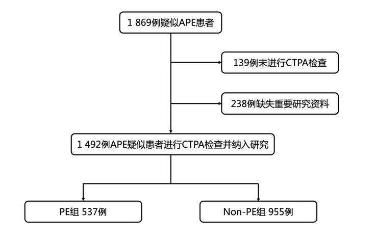 2 结果共筛选疑似APE患者1 869例,排除因肾功能不全、碘过敏、妊娠、血液动力学不稳定等因素未经过CTPA确诊的患者139例,以及缺失重要研究资料的患者238例,最终共纳入研究1 492例,根据CTPA结果分为PE组(537例)和Non-PE组(955例)。见图 1。