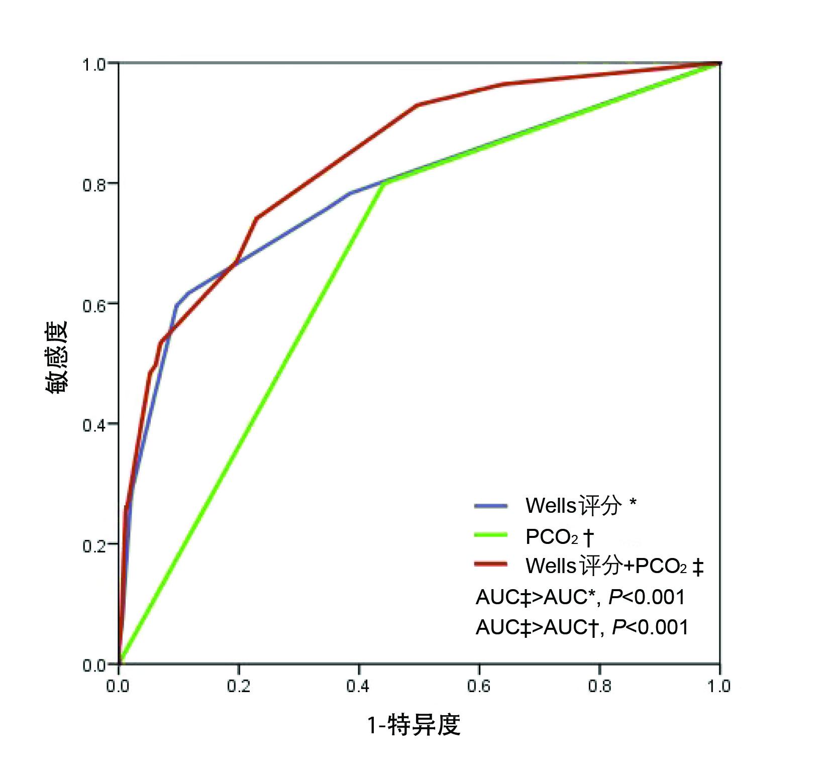 | 图 2 Wells评分、PaCO2降低及二者联合的ROC曲线比较 Fig 2 Comparison of ROC curves of Wells score, PaCO2 reduction and their combination |