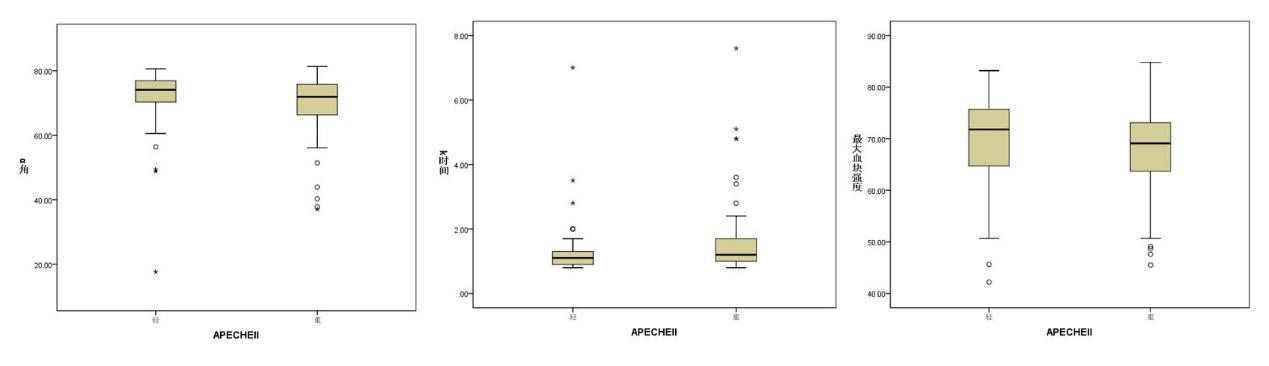 应用非参数秩和检验发现,不同严重程度间的脓毒症患者的TEG指标中α角、K时间以及最大血块强度之间差异有统计学意义。即重度的脓毒症较轻度的脓毒症其α角减小、K时间明显延长,最大血块强度增强,见表 2图 1