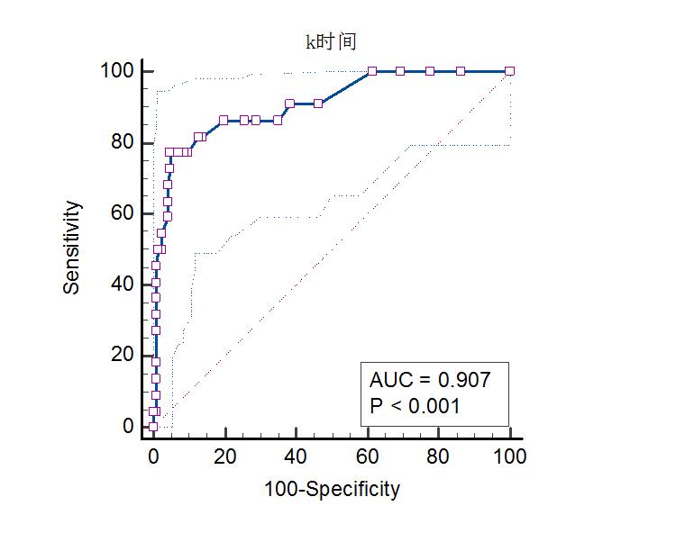 通过受试者曲线用K时间对脓毒症的死亡组进行评估发现,当K时间≥2.2 min时(此时敏感度为77.27%,特异度为95.20%;曲线下面积为0.907,95%CI为0.848~0.949)时,可判断脓毒症发生死亡的风险最大,诊断存在统计学意义(P < 0.01),见图 2
