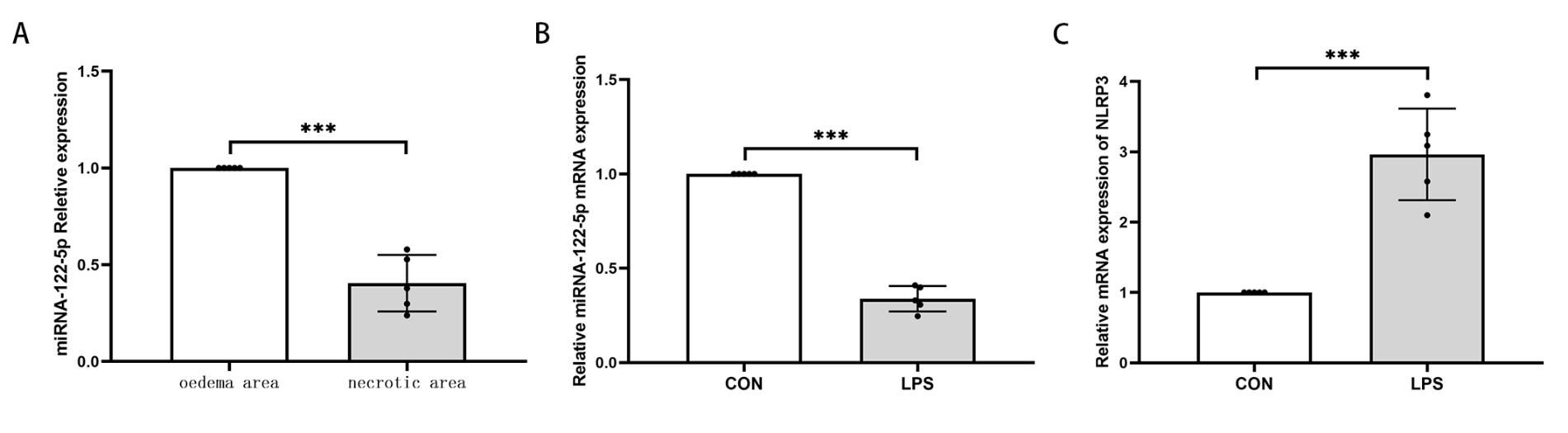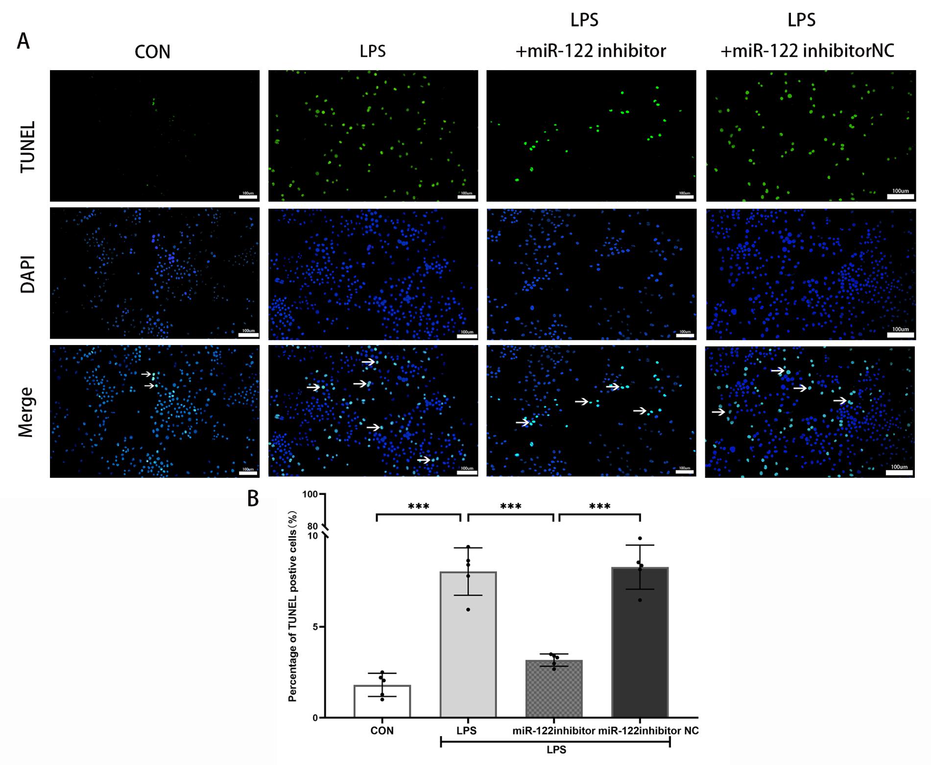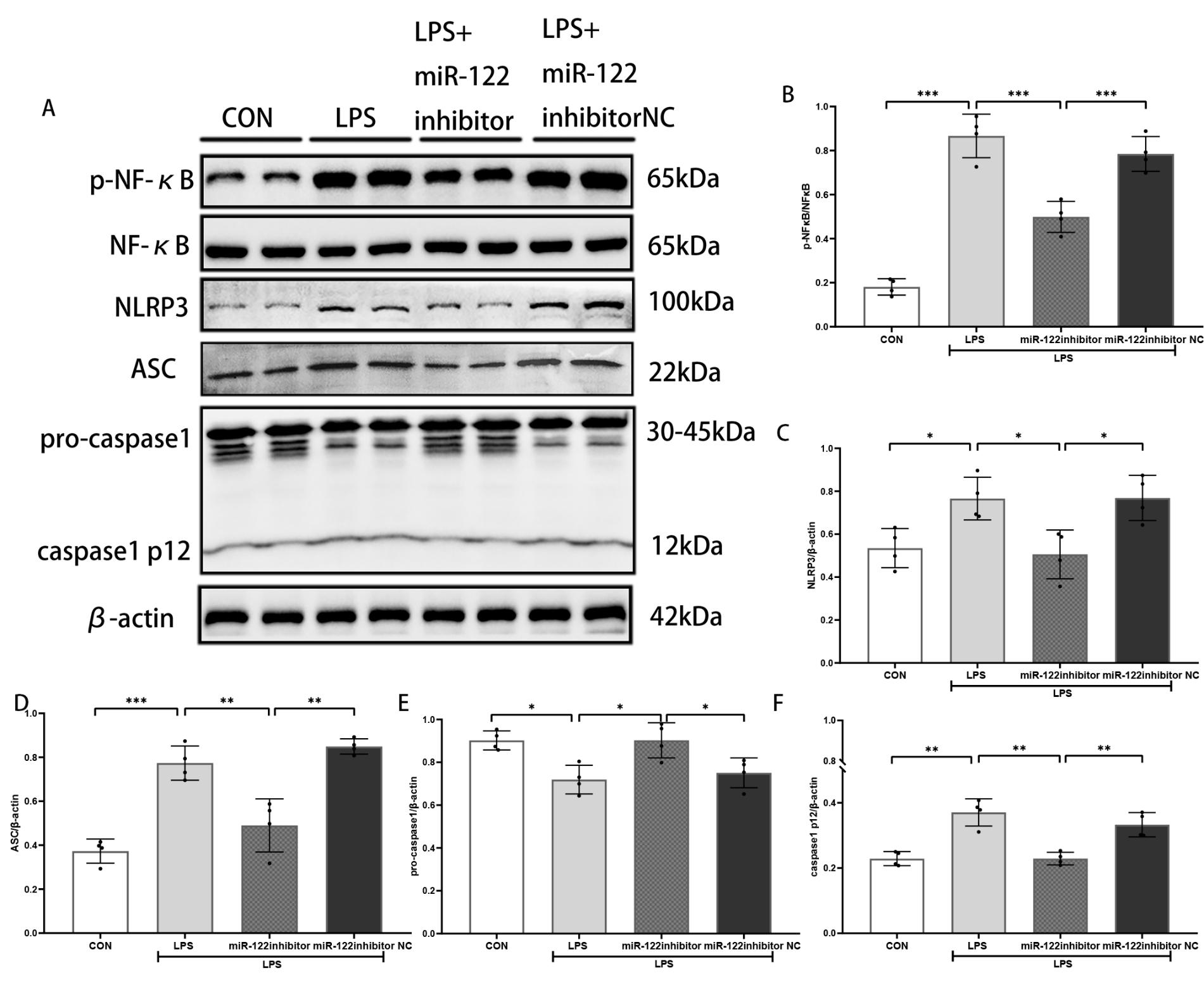 细胞实验分组:对照组(CON组)、脂多糖组(LPS组)、脂多糖+miR-122-5p抑制剂组(LPS+ miR-122 inhibitor组)、脂多糖+miR-122-5p抑制剂阴性对照组(LPS+miR-122 inhibitor NC组)。