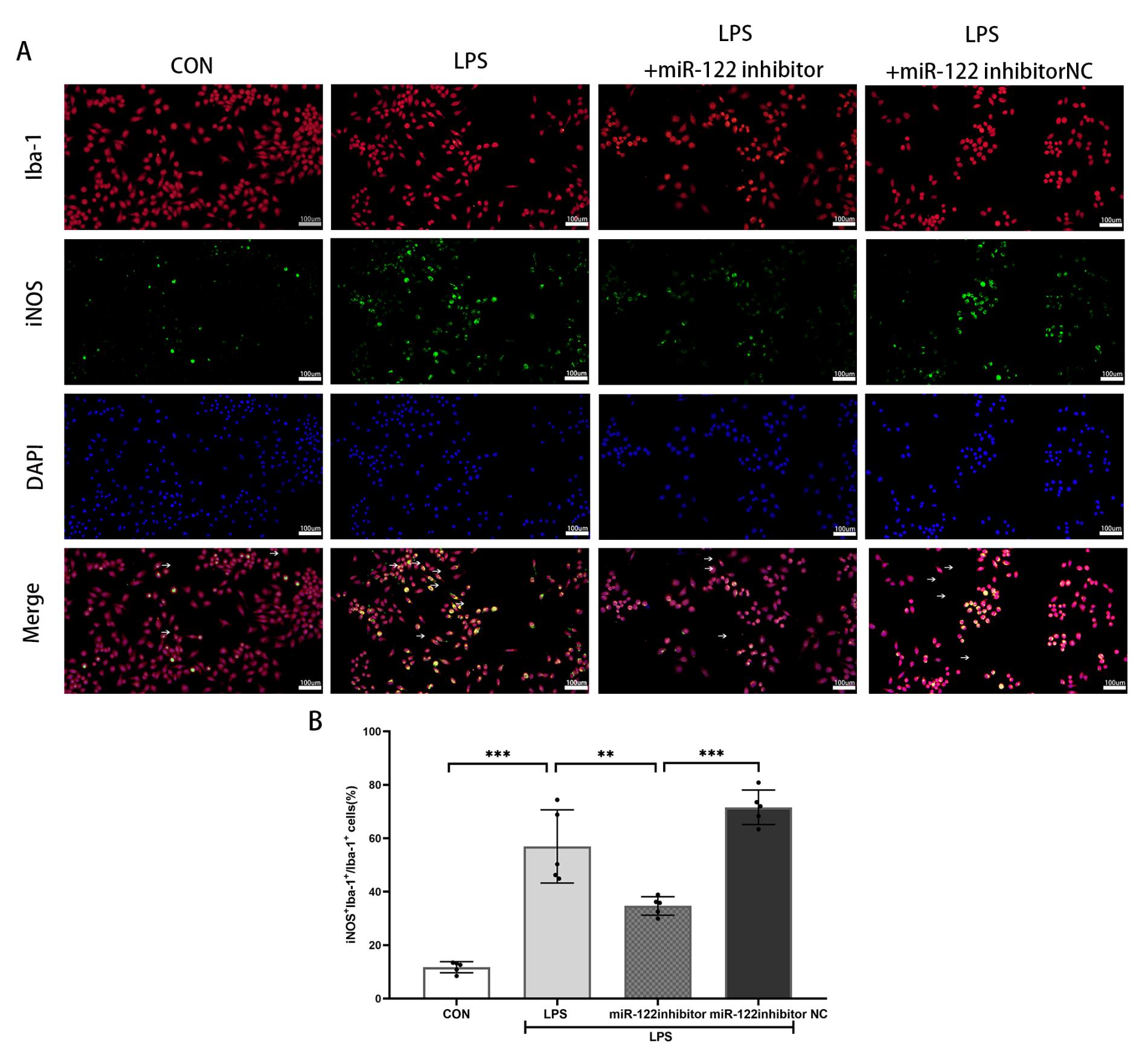 Iba1(红色荧光)为小胶质细胞,iNOS(绿色荧光)为小胶质细胞M1型,Arg1(绿色荧光)为小胶质细胞M2型,DAPI(蓝色荧光)为细胞核。A:各处理组小胶质细胞M1型标志物iNOS+免疫荧光表达代表性图片; B:iNOS+Iba-1+细胞百分比,与对照组相比,aP<0.001(n=5),与LPS组相比,bP<0.01(n=5),与LPS+miR-122 inhibitor NC组相比,aP<0.001(n=5); C:各处理组小胶质细胞M2型标志物Arg1+免疫荧光表达代表性图片; D.Arg1+Iba-1+细胞百分比,bP<0.01,aP<0.001,n=5。比例尺100 μm。 图 3 抑制miR-122-5p表达,促进LPS损伤后小胶质细胞向M2表型转化 Fig 3 Inhibition of miR-122-5p promotes microglia M2 phenotype transformation after LPS injury