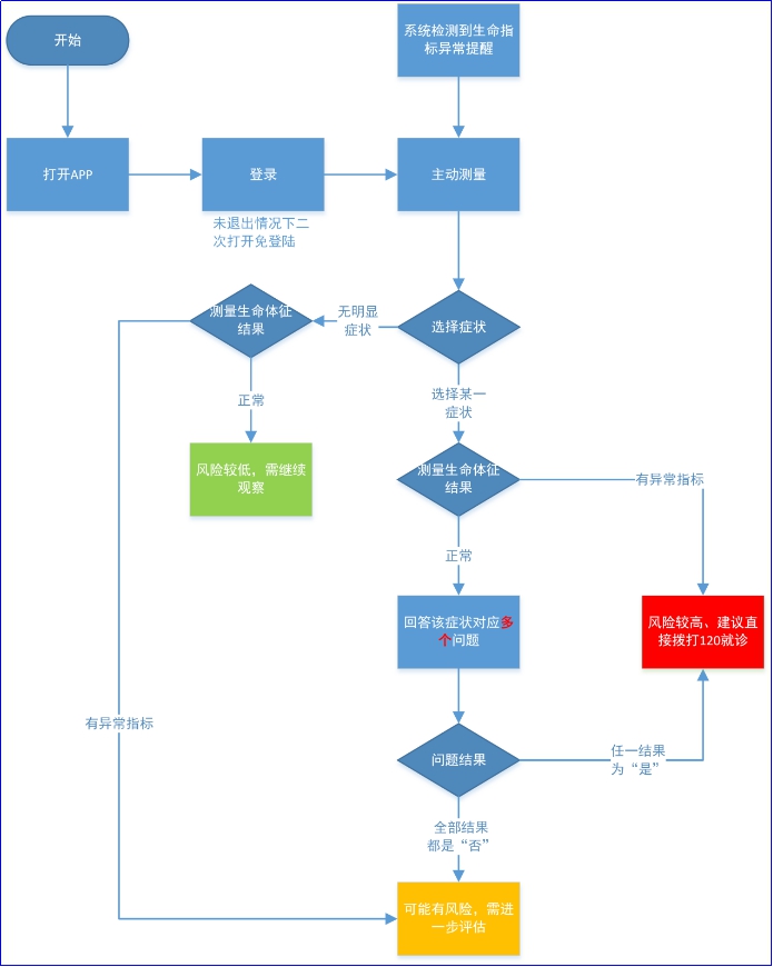 可穿戴设备持续监测用户的生命体征信息,根据预设标准进行预警。当出现异常生命体征时,本APP会建议用户再次测量生命体征,用户根据实际情况选择对应的症状,并快速回答症状对应的问题,APP将综合监测结果和问题答案给出就医建议。