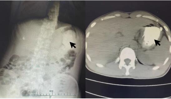 图 1 患者外院立位腹部平片和胸部CT平扫示胃腔内大量高密度影