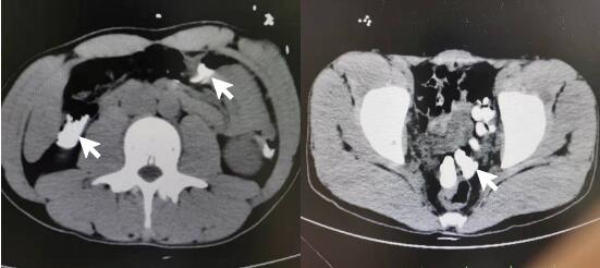 图 2 患者入院1 d后腹部CT平扫示结肠内高密度影
