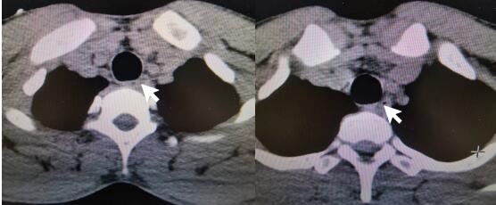 图 3 患者入院5 d后食道CT平扫示食管局部管壁稍水肿增厚,管腔狭小