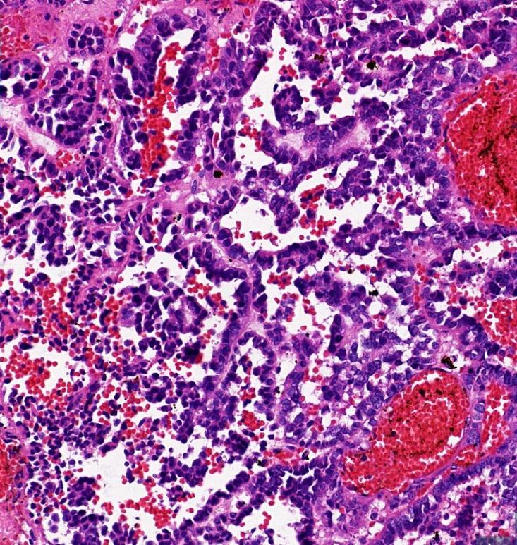 图 2 部分区域肿瘤形成复杂的乳头状结构(HE染色,中倍镜)
